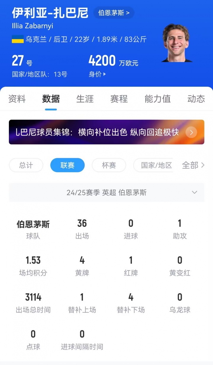 22岁的扎巴尼上赛季为伯恩茅斯出战36场英超,与怀森组成的中卫组合受到多支欧洲豪门关注。球员目前的德转身价为4200万欧元。
